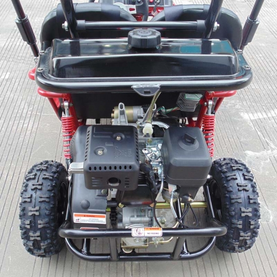 c’est un siège double, suspension complète disparaissent Kart équipé avec 163cc, 5.5HP moteur démarreur électrique avec début de traction arrière vers le haut et caractéristiques 2 roues motrices et un embrayage centrifuge, simple contrôle avec stop / go pied pédales. La Transmission est un facile à utiliser et entièrement automatique avec marche arrière avec la ceinture de sécurité 5 points.